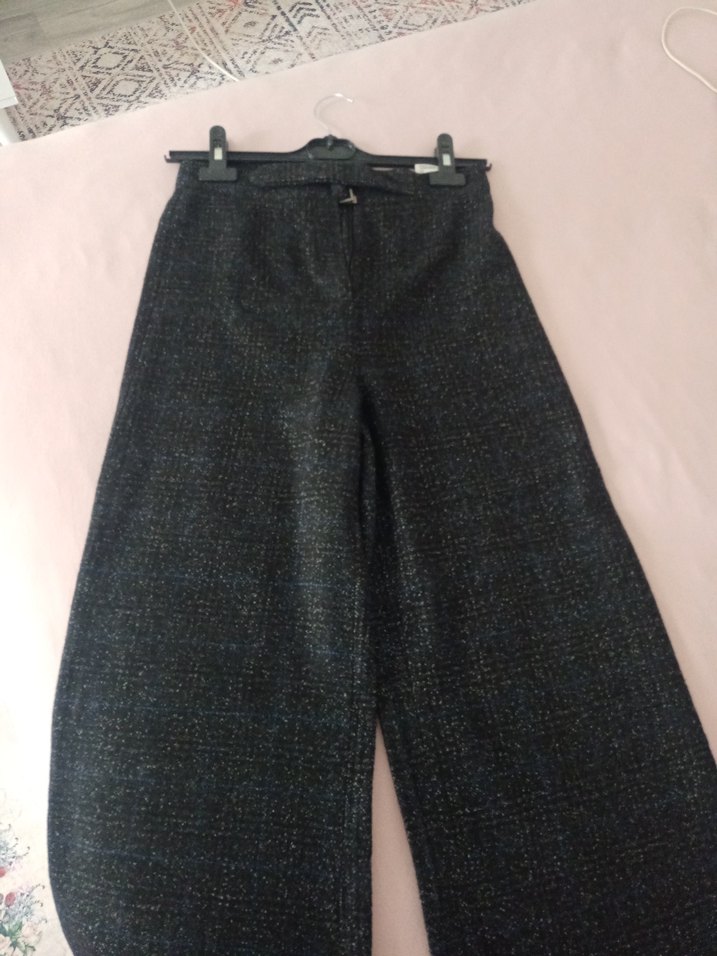 Gri midi uzunlukta, palazzo kesim kumaş pantolon. Kemerli, koyu renkte ve desen içermeyen tasarım, ofis ve günlük sokak tarzı için uygun.