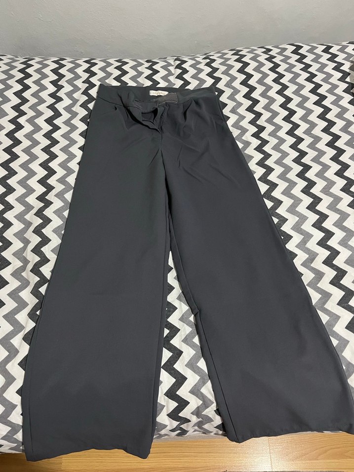 Gri midi boy kadın pantolon, regular fit ve kemerli. Düz dokulu sentetik kumaştan, iş ve günlük kullanıma uygun.