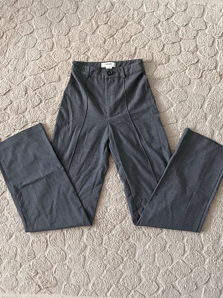 Gri renkte, midi boy ve regular fit kesime sahip denim kumaştan yapılmış kadın pantolonu, ofis için şık ve rahat bir tercih sunar.