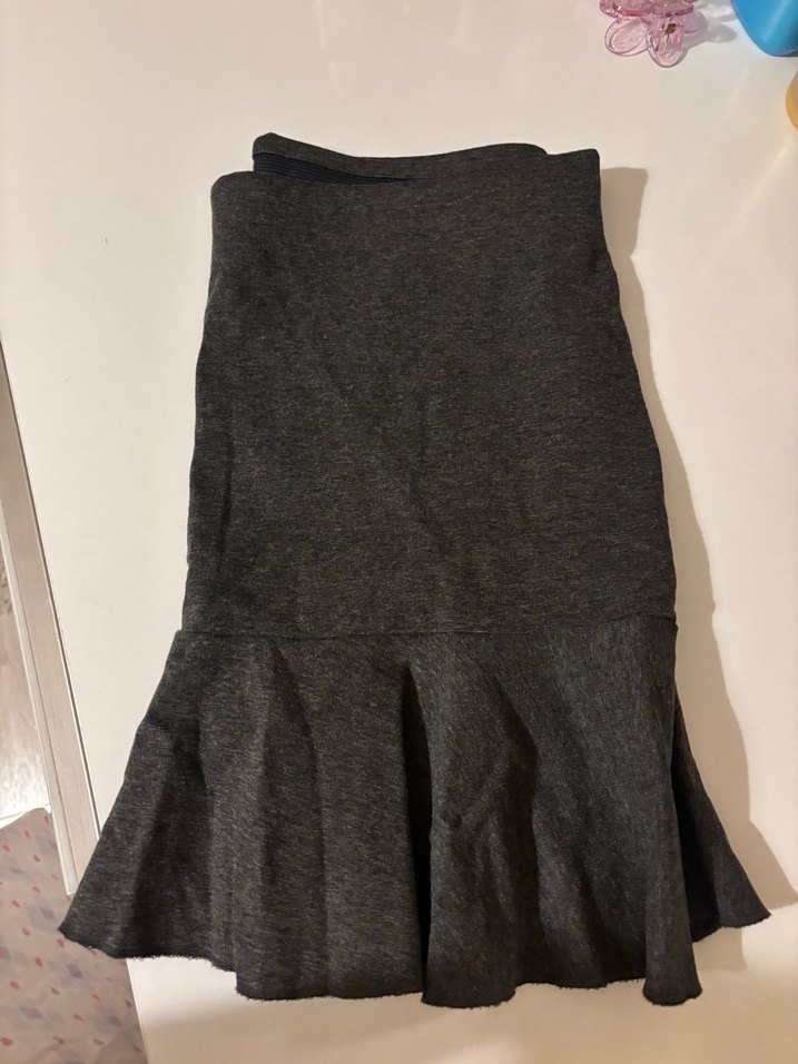 Gri midi fırfırlı eteği, yumuşak sentetik kumaştan, vücuda oturan kesimi ve fırfır detaylarıyla günlük kullanıma uygun. mudodan alındı bir kere giyildi kilodan satıyorum