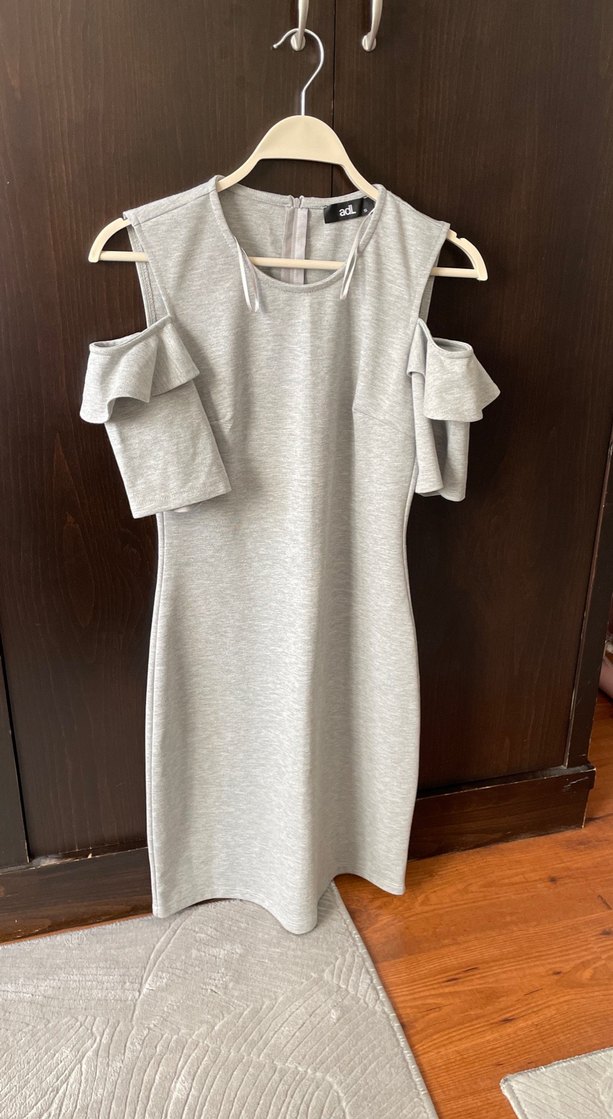 Gri midi elbise, kısa omuzları açık kollar ve fırfır detayları ile dar kesim. Düz, yumuşak sentetik kumaştan yapılmıştır. Trendy günlük stile uygun.