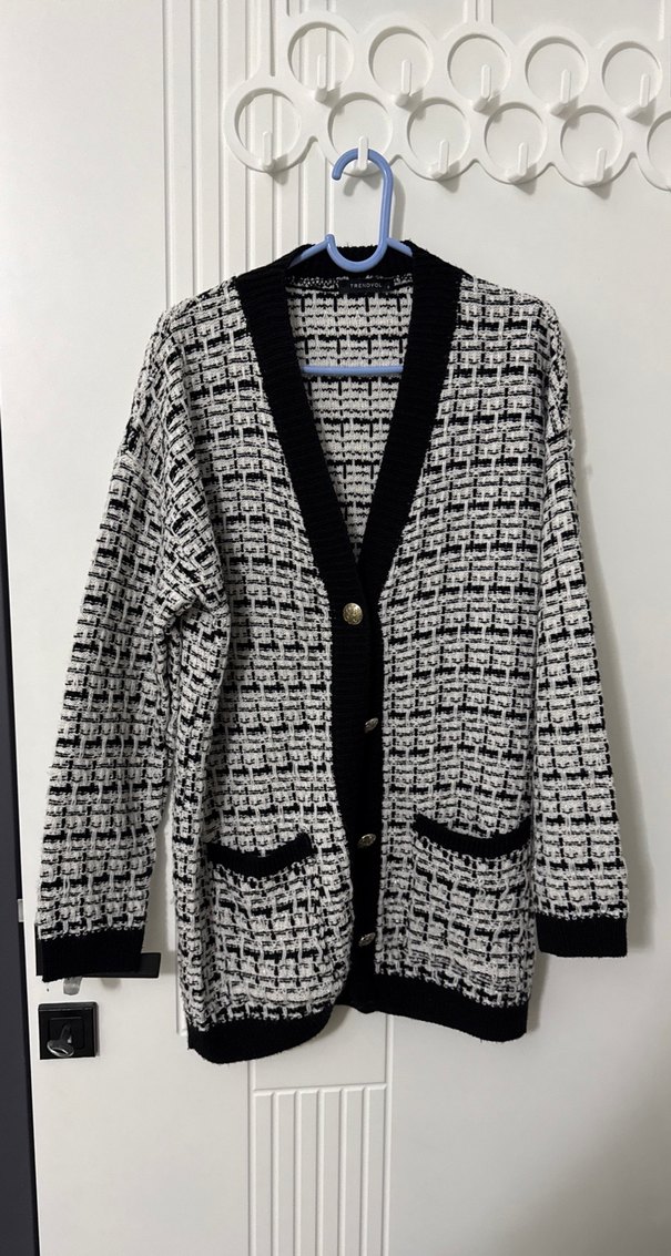 Gri renkli, siyah detaylı, midi uzunlukta, uzun kollu ve geniş kesim örgü kadın hırka. Notlu yakası ve ön cepleri bulunur.