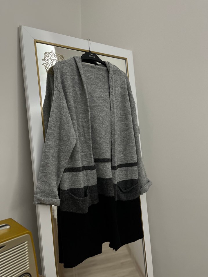 Gri mini boy, bol kesim, uzun kollu, yumuşak yün örme kadın hırka. Düz renk, günlük kullanıma uygun . Gerçekten kaliteli