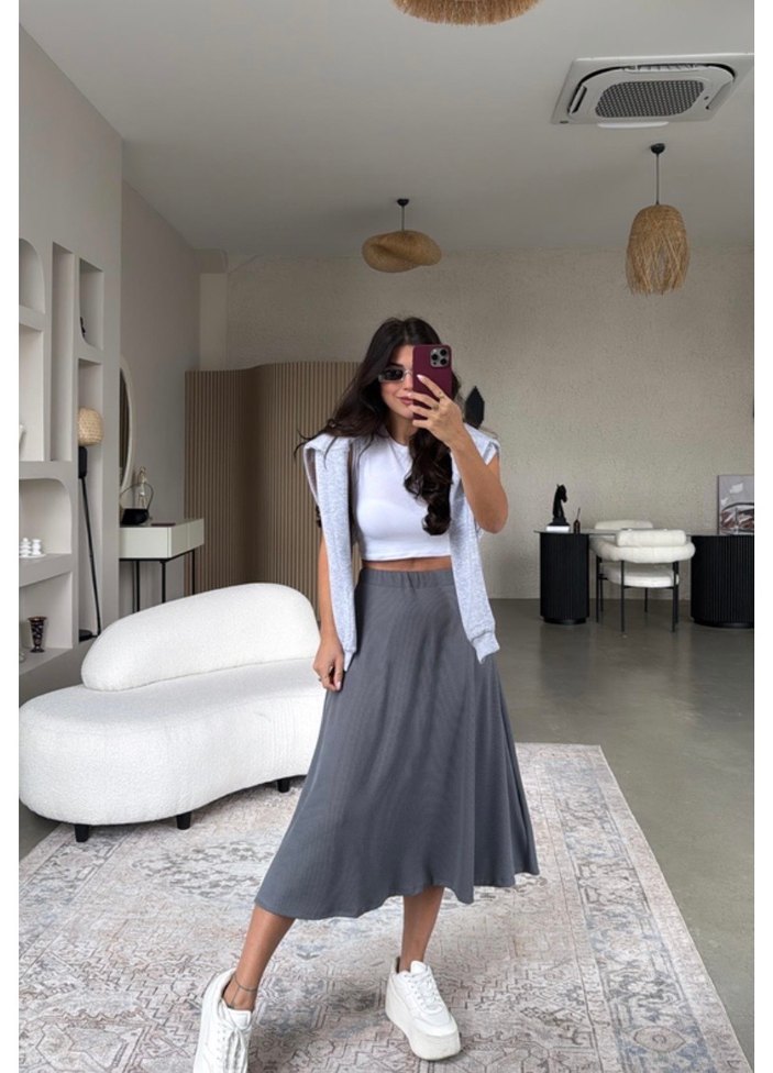 Gri midi uzunlukta, pamuklu ve salaş kesime sahip bu etek, günlük kullanıma uygun zahmetsiz şıklık sunar. Desensiz ve normcore tarzda tasarlanmıştır.