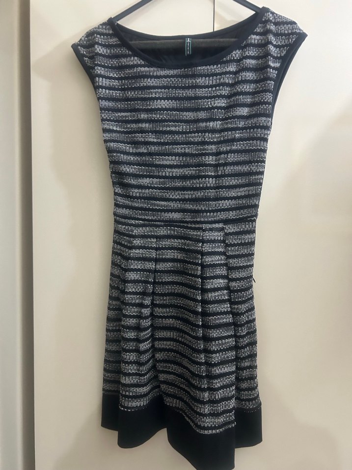 Gri renkte, tek renk, tek parça, pilili etekli, bisiklet yaka, kolsuz, midi boy, dar kesim kadın elbisesi.