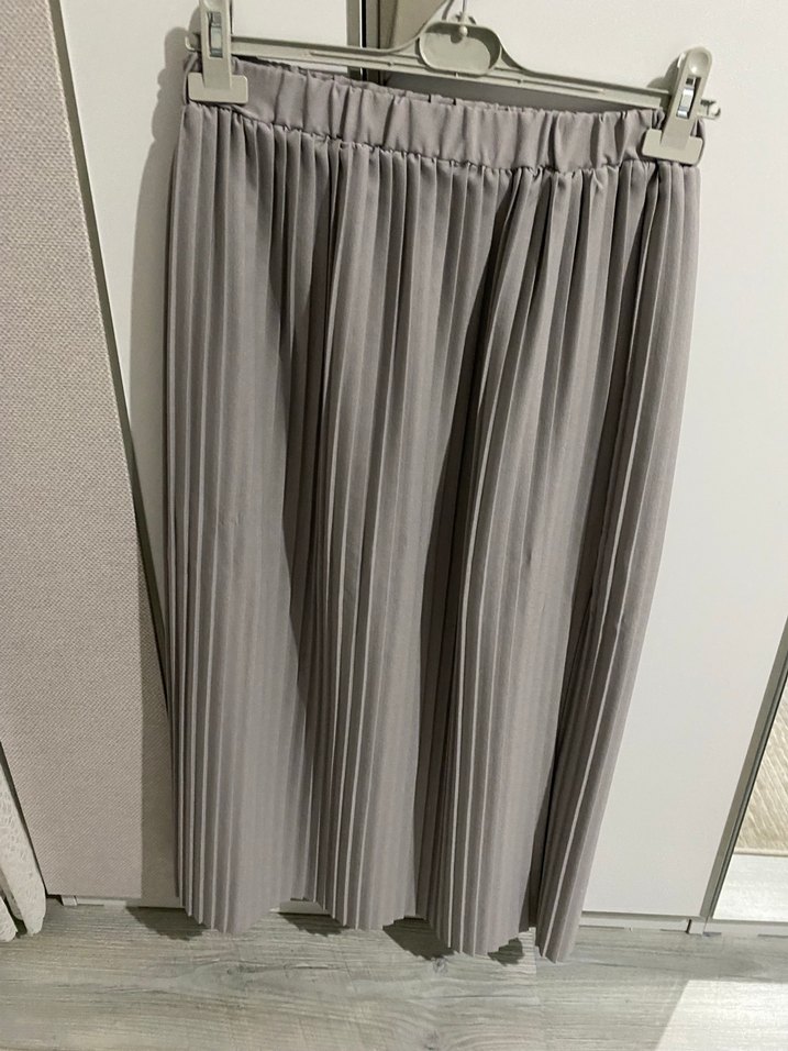 Gri midi uzunluğunda, piliseli ve düz kesime sahip kadın eteği. Sentetik kumaştan, minimalist ve normcore tarzında, ofis için uygun. İkili takımdır