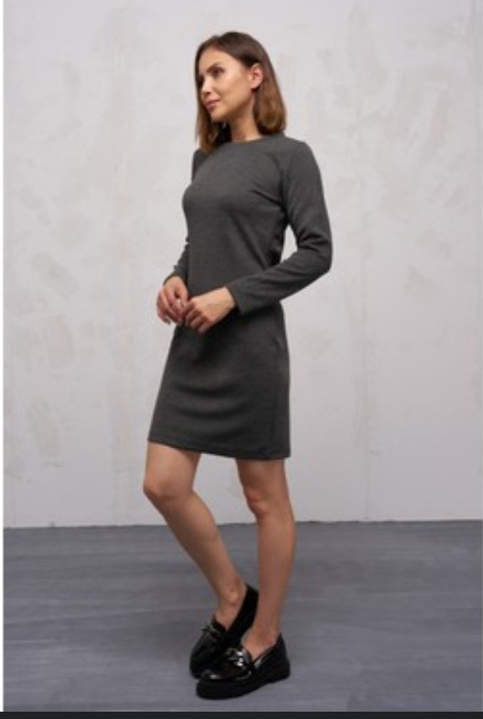 Gri midi viskos elastan dokuma kumaş elbise, yuvarlak yaka ve uzun kolludur. Rahat kesimi ve sade tarzıyla ofis için uygundur. Yumuşak sentetik kumaştan üretilmiştir. 84 santim uzunluğunda iki koltuk arası genişliği 40 santimdir