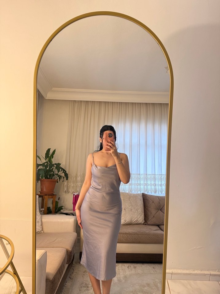 Gri renkli, saten görünümlü hafif transparan kumaştan yapılmış, vücuda oturan midi elbise. Romantik akşamlar için ideal.
