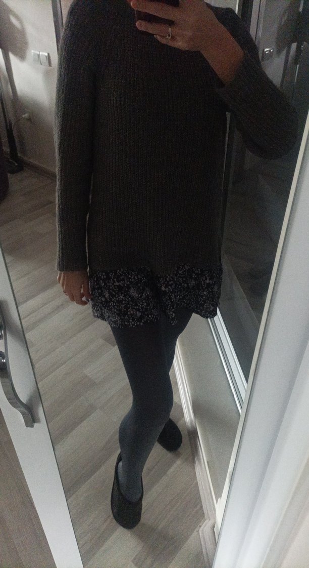 Gri renkte, uzun kollu, yuvarlak yaka ve bol kesime sahip hamile triko kazak. Günlük kullanım için uygun, rahat ve desensiz tasarım.