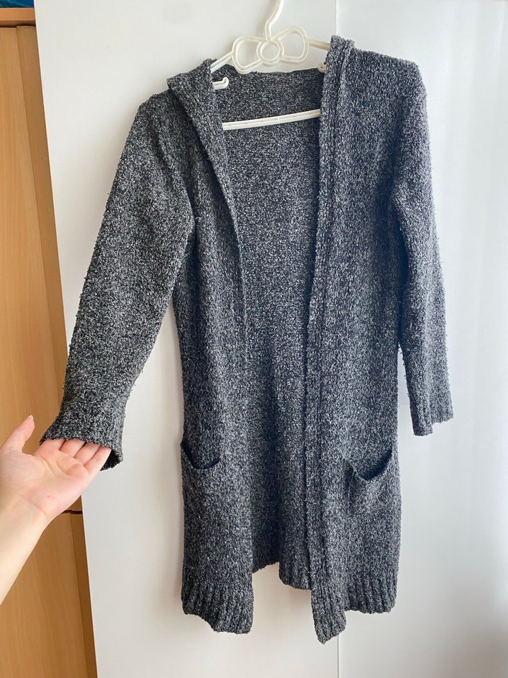 Gri renkte, uzun kollu ve yakalı midi uzunlukta, örgü triko hırka. Günlük rahat kullanıma uygun, sade ve şık bir tasarım. Uzunluğu görselde verilmiştir.