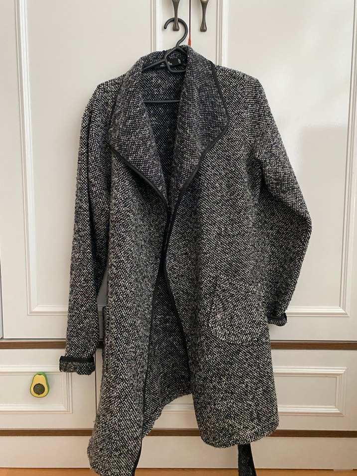 Gri midi uzunlukta, triko dokulu, kesik yaka yakalı kadın kabanı. Uzun kollu, normal kesim, günlük rahat kullanım için uygundur.