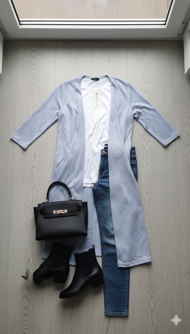 Gri midi uzunluğunda, bol kesim hırka. Yaka kısmı kırmalı ve uzun kolludur. Günlük kullanıma uygun rahat ve şık bir modeldir.
