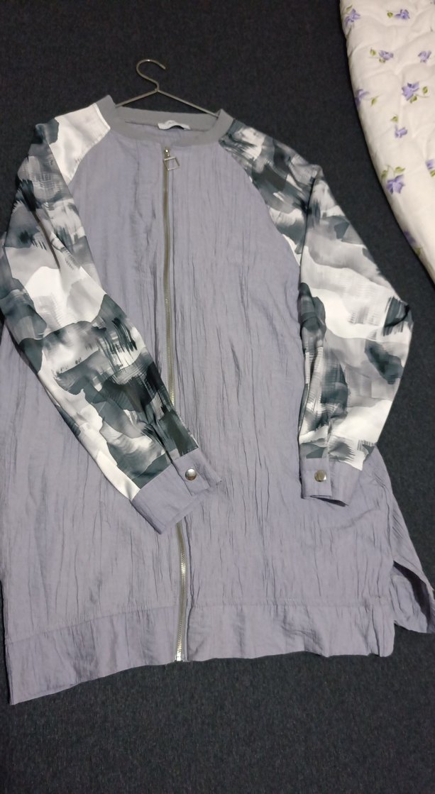 Gri renkte, uzun baskılı kollu, yüksek yakalı, keten kumaştan midi uzunlukta ve fermuarlı bol kesim ceket.