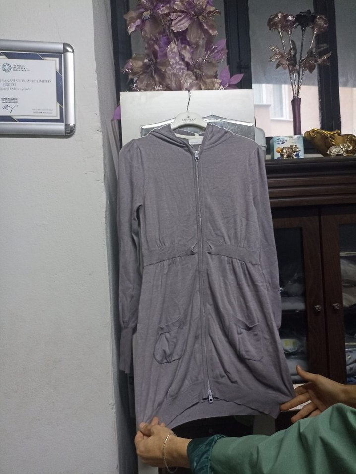 Gri renkli, uzun kollu ve bisiklet yaka hamile ceketi. Önü fermuarlı, hafif keten kumaştan, günlük kullanıma uygun rahat model.