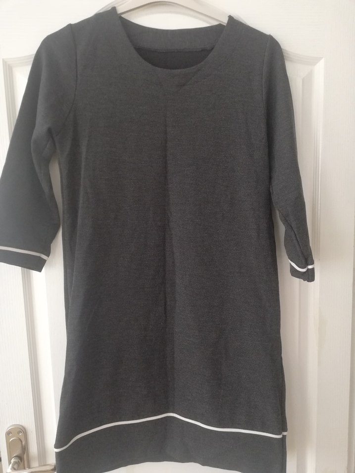 Sentetik kumaştan, yuvarlak yakalı, uzun kollu, gri midi rahat elbise. Minimalist ve desensiz tasarımıyla günlük kullanım için şık ve rahat.