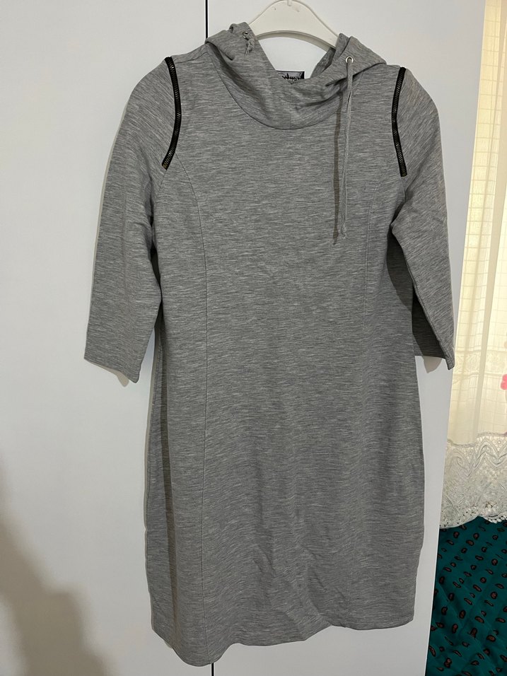 Gri midi uzun kollu triko elbise, kapüşonlu ve yüksek yaka ile. Fermuarlı detaylara sahip, yumuşak sentetik kumaştan günlük kullanım için uygundur.