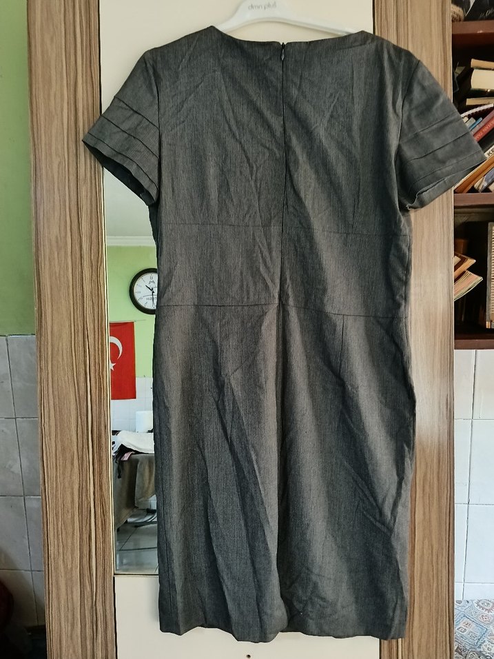 Gri midi elbise, V yaka ve kısa kolludur. Düz sentetik kumaştan yapılmış, normal kesim ve pliseli detaylara sahiptir. Ofis için uygundur.