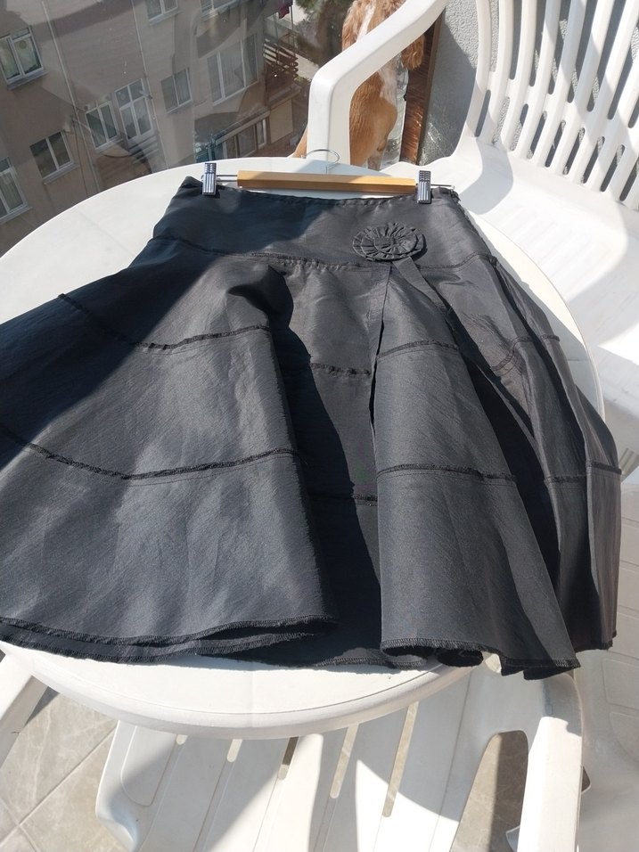 Gri midi boy, bol kesim kadın etek, volan ve baskılı desen detaylarıyla sentetik kumaştan üretilmiştir. Günlük gotik tarz için uygundur.