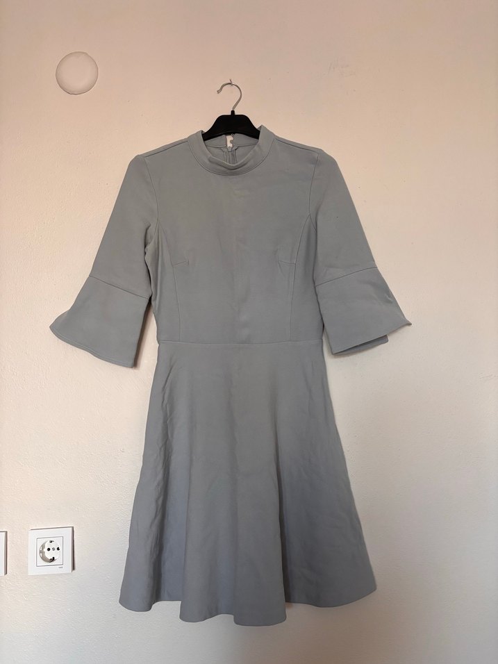 Gri midi boy, yüksek yakalı, belden oturan ve kısa kolları volanlı kadın elbisesi. Yumuşak sentetik kumaştan, pileli ve minimalist tasarıma sahiptir. Tok ve kaliteli bir kumaşa sahiptir