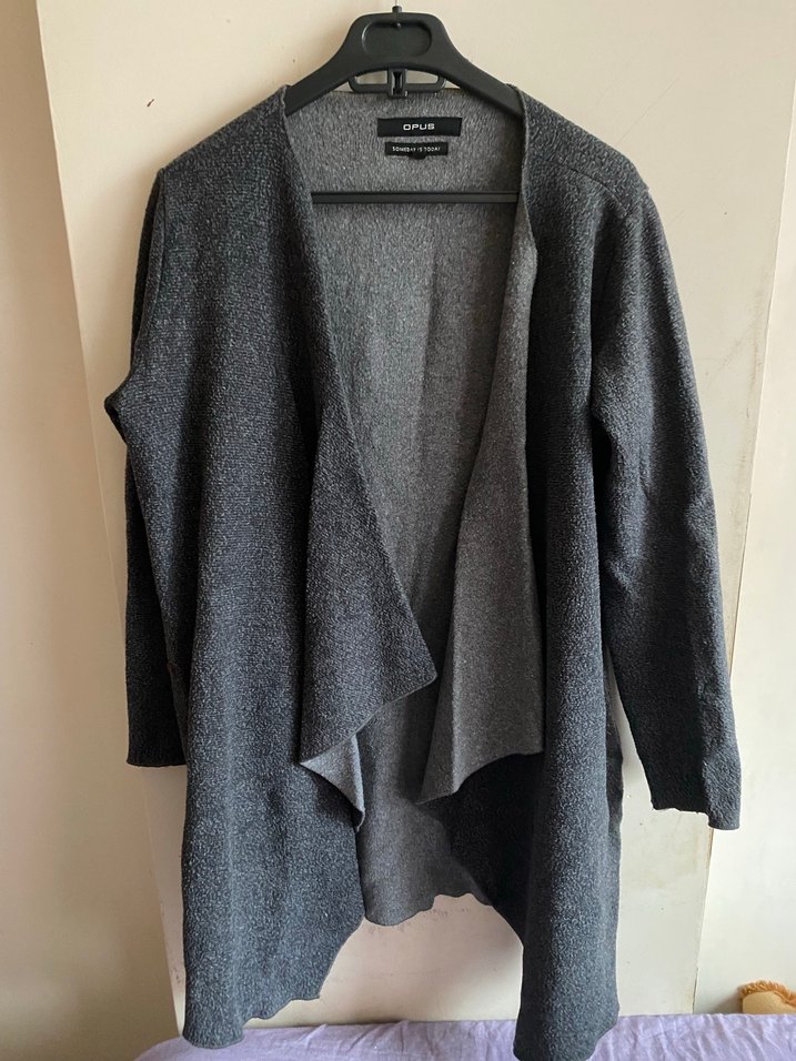 Gri yün hamile kabanı, notched lapel yakaya ve drapeli tasarıma sahip, bol kesim ve uzun kolludur, günlük kullanıma uygundur.