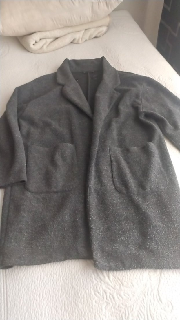 Gri renkte, yün kumaştan yapılmış, normal boyda ve düğmeli kadın kaban. Geniş kesim, uzun kollu ve cepli, günlük kullanıma uygun.