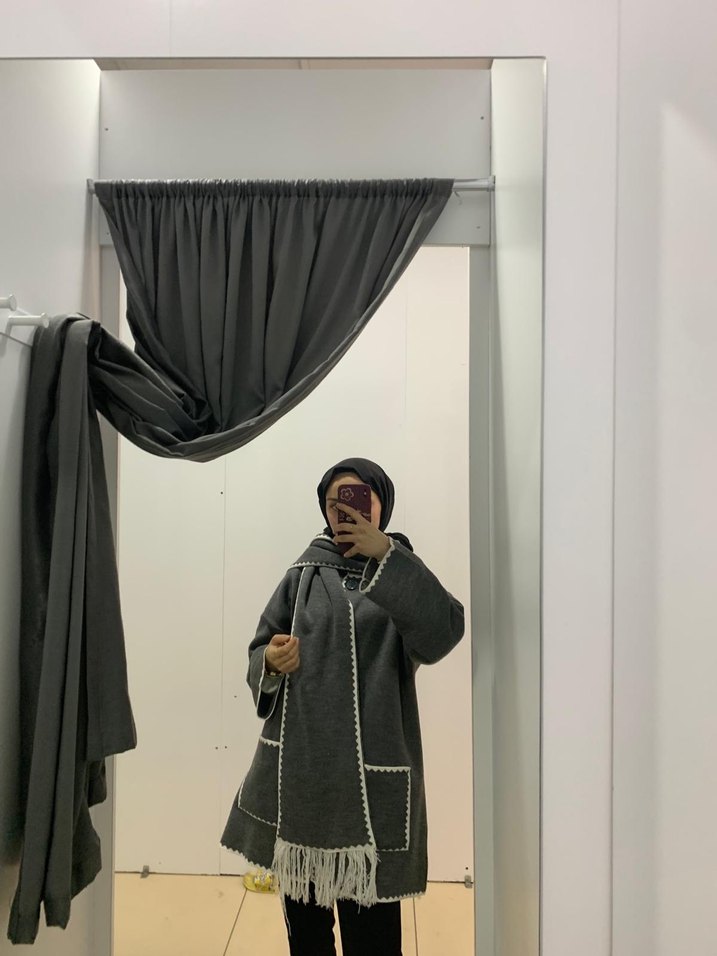 Atkılı gri midi uzunluğunda, yüksek yakalı ve uzun kollu kadın yün kaban. Bol kesimi ve drapeli tasarımı ile günlük kullanıma uygun, modest ve rahat bir modeldir. Büyük cepleri ve püskül detayları bulunur.
