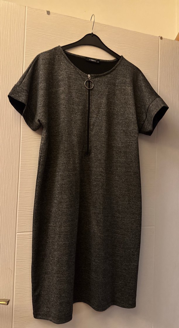 Gri midi elbise, kısa kollu ve yuvarlak yakalıdır. Bol kesim ve fermuar sahiptir. Yumuşak sentetik kumaştan üretilmiştir.