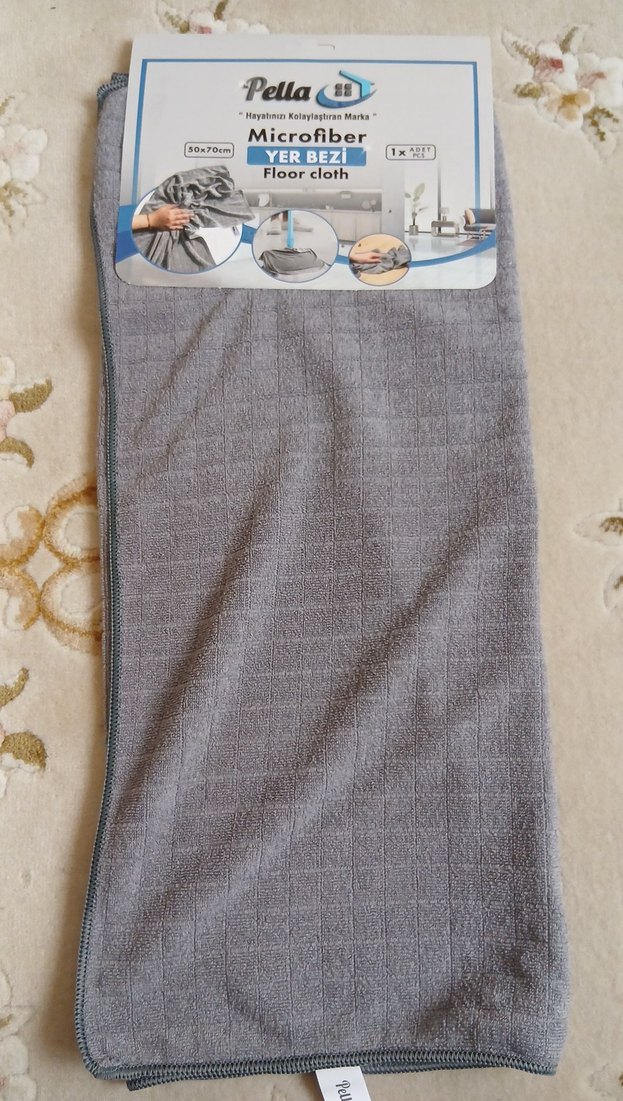 Gri mikrofiber yer bezi, 50x70 cm ölçüsünde, yumuşak ve emici yapıya sahip, desensiz ve çağdaş tarzda.