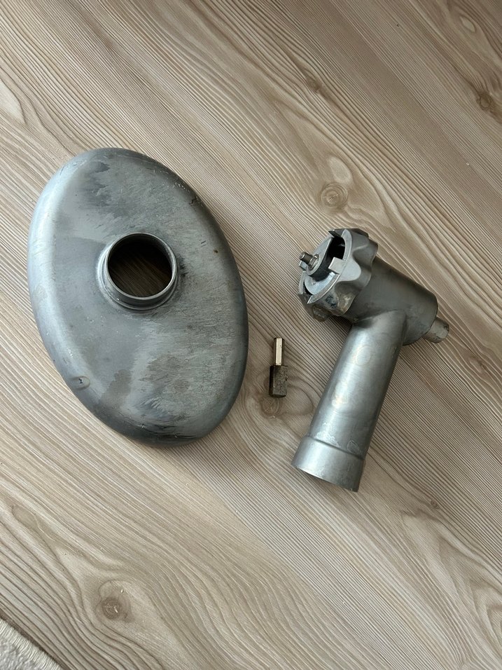 Gri metal mikser parçalarından oluşan set, kapak, bağlantı borusu ve küçük bağlantı parçası içerir. ⚙️