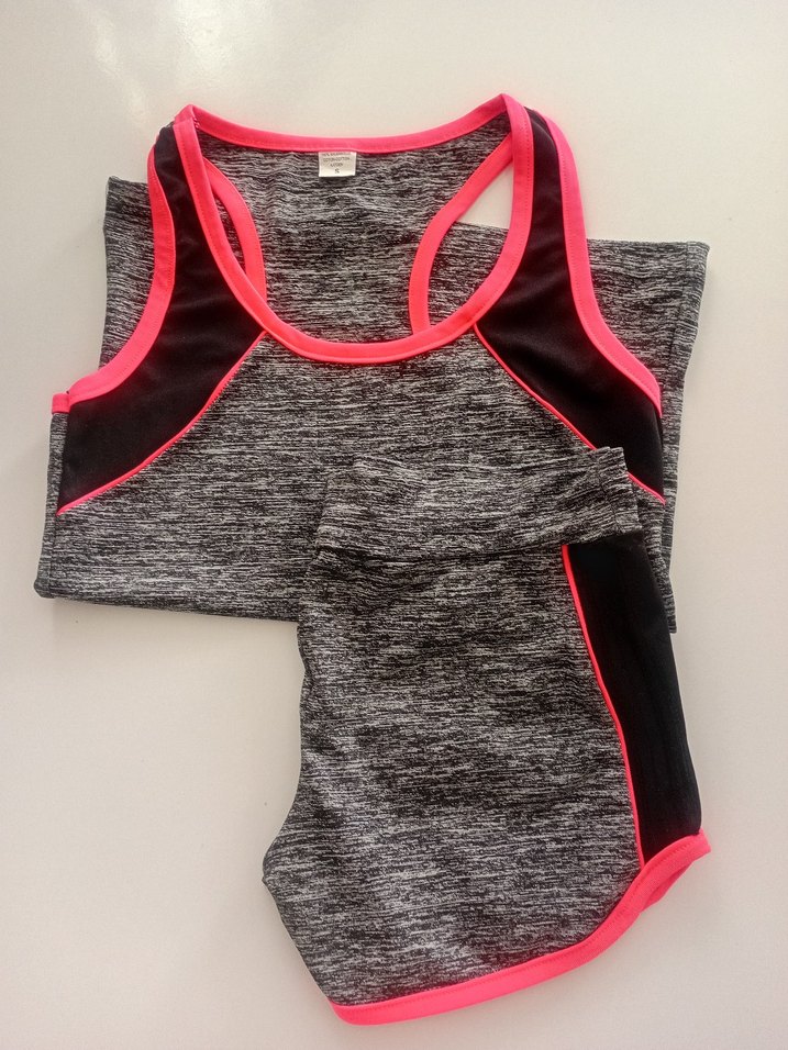 Gri ve siyah tonlarında, pembe elastik detaylı kısa atlet ve şort takımı, spor ve günlük kullanıma uygun.