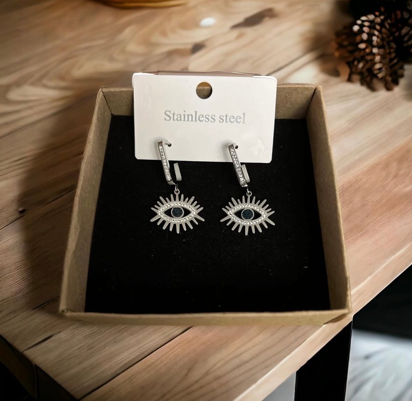 Gri renkte, mini uzunlukta, pul işlemeli göz figürlü kısa küpeler. Paslanmaz çelikten yapılmıştır, günlük kullanıma uygundur.