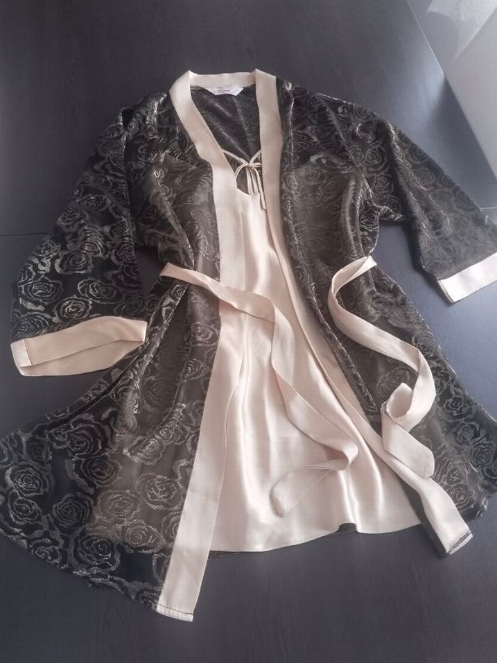 Gri renkte, askılı kısa mini gecelik ve ince çiçek desenli saten sabahlık. Rahat ve bohem tarzda uyku kıyafeti.