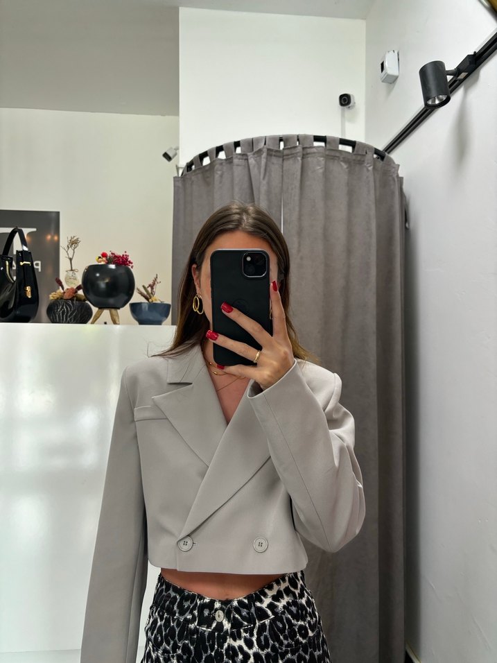 Gri mini crop blazer, kesik yakalı ve uzun kollu, düz sentetik kumaştan. Ofis ve sokak stilini birleştirir, rahat kesimiyle şık ve trend bir görünüm sunar.