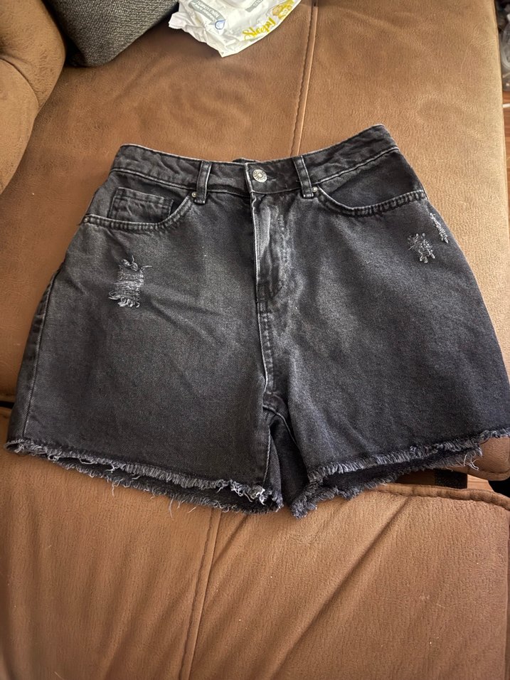 Gri renkte ve kısa boyda, tokalı detaylara sahip denim şort. Günlük kullanım için uygun, rahat ve sokak modasına uygun.