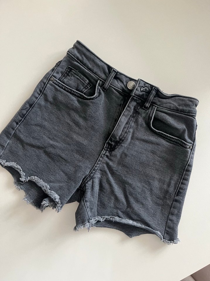 Fitted kesim, kısa boy gri denim şort, salaş sokak stili için yıpranmış kenar detayına sahip. Günlük kullanıma uygun, zahmetsiz şıklık sunar.