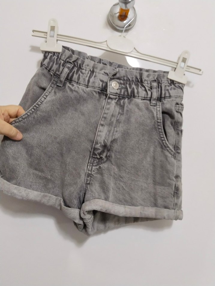 Gri mini denim şort, bağlamalı bel ve bol kesim ile rahat bir sokak stili sunar. Katlanmış paçalar ve batik desenlidir.