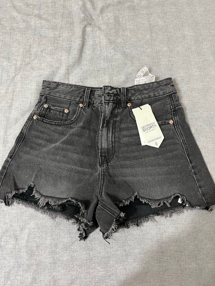 Gri renkte, salaş kesim mini denim şort, yırtık detaylı kenarlarıyla rahat ve şık bir günlük sokak stili sunar.