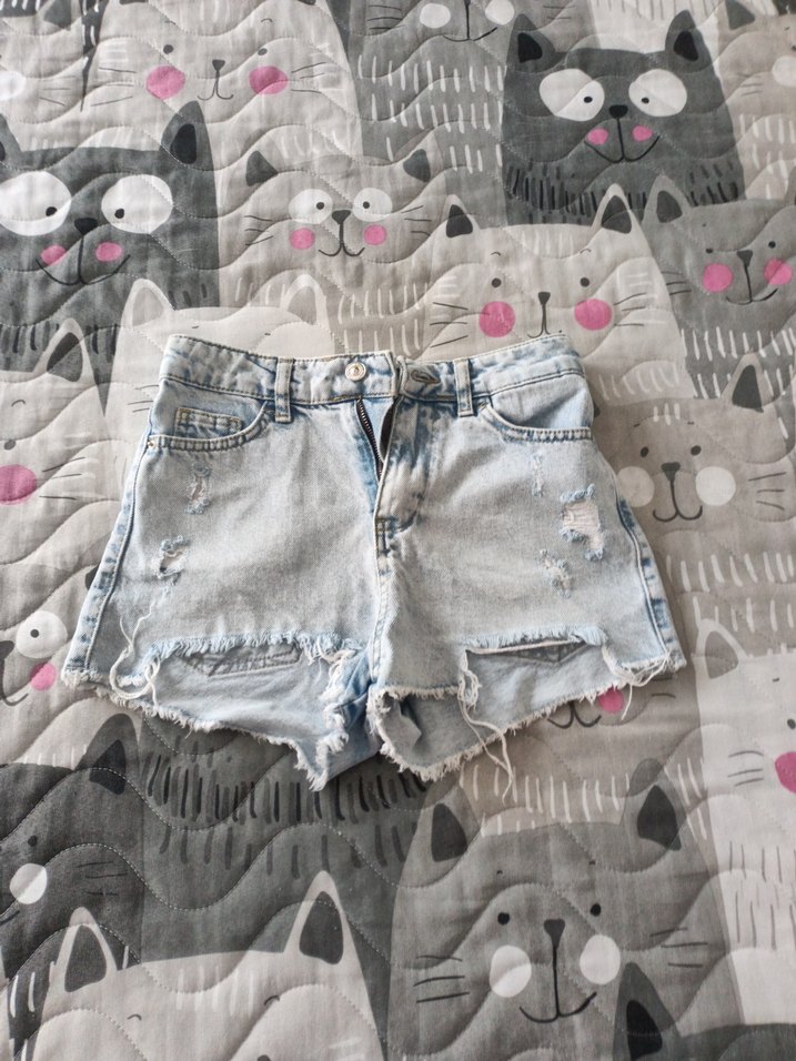 Düğmeli, bol kesim gri mini kot şort, yıpranmış detaylarla günlük sokak stiline uygun.