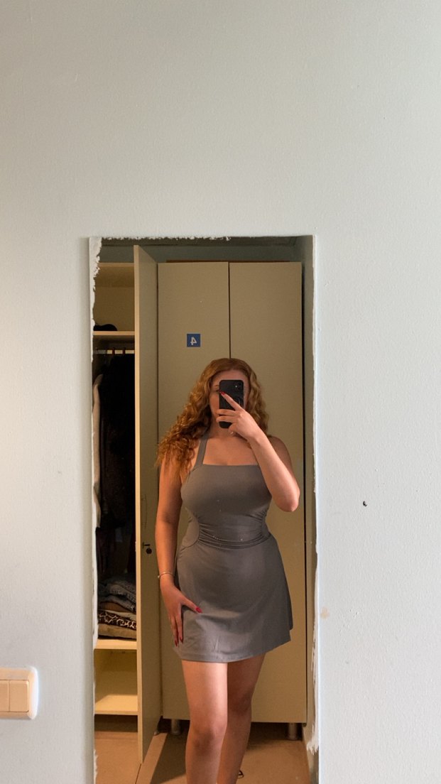 Gri mini elbise, straplez ve arkadan bağlamalı üst kısmı. Eteğin boyu bana çok kısa geldi 170 boyum, rahat hissettirmedi o yüzden satıyorum. Yanlardaki büzgülerini çok sevdim daha zarif duruyor