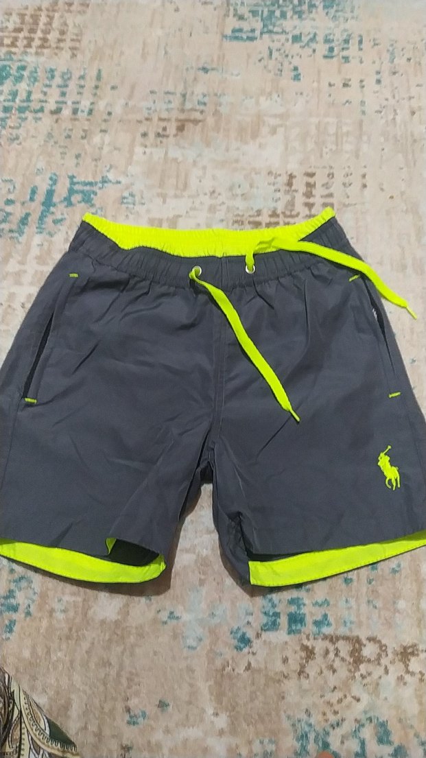Neon sarı kemer ve detaylı, gri renkli, bol kesim mini erkek yüzme şortu. Düz ve rahat, plajda kullanıma uygun. 6 yasa uygundur
