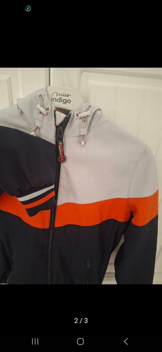 Fermuarlı, yüksek yakalı ve uzun kollu, sentetik kumaştan gri, siyah ve turuncu baskılı mini erkek yağmurluk. Outdoor sokak stili için uygundur. ️