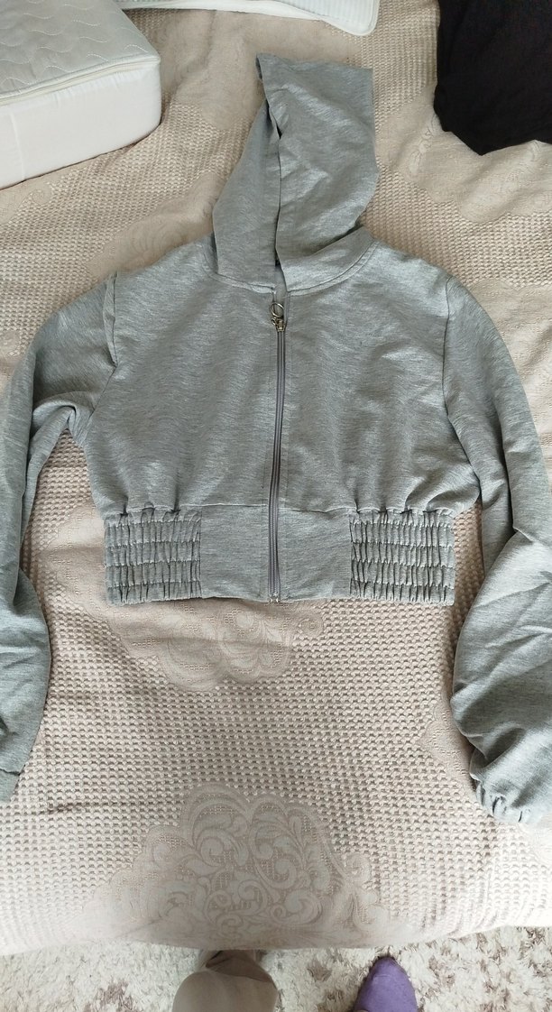 Gri renkli, yüksek yakalı ve fermuarlı kadın sweatshirtü. Kısa boylu, uzun kollu ve bel kısmı lastikli, rahat keten kumaştan üretilmiştir.