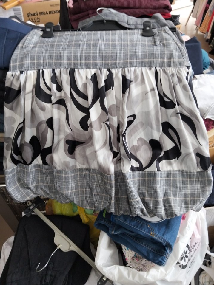Gri tonlarında, volan detaylı ve tie-dye desenli, rahat kesim mini hamile eteği, yumuşak sentetik kumaştan yapılmıştır.