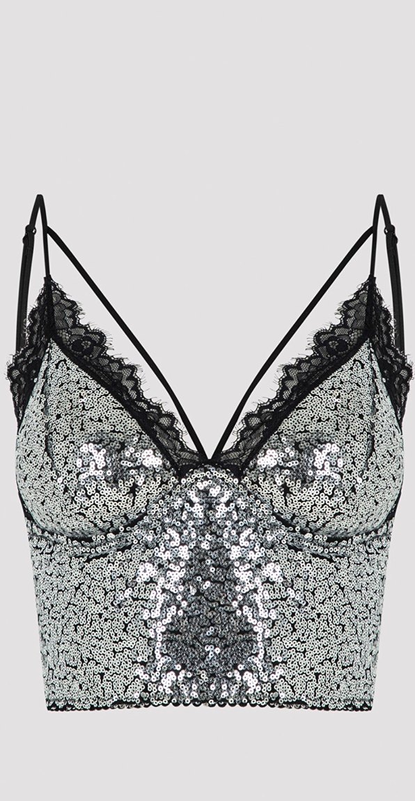 Gri renkli, işlemeli ve dantelli V yaka, ayarlanabilir ince askılı, kısa kesim, dikkat çekici ve gösterişli mini büstiyer. ✨