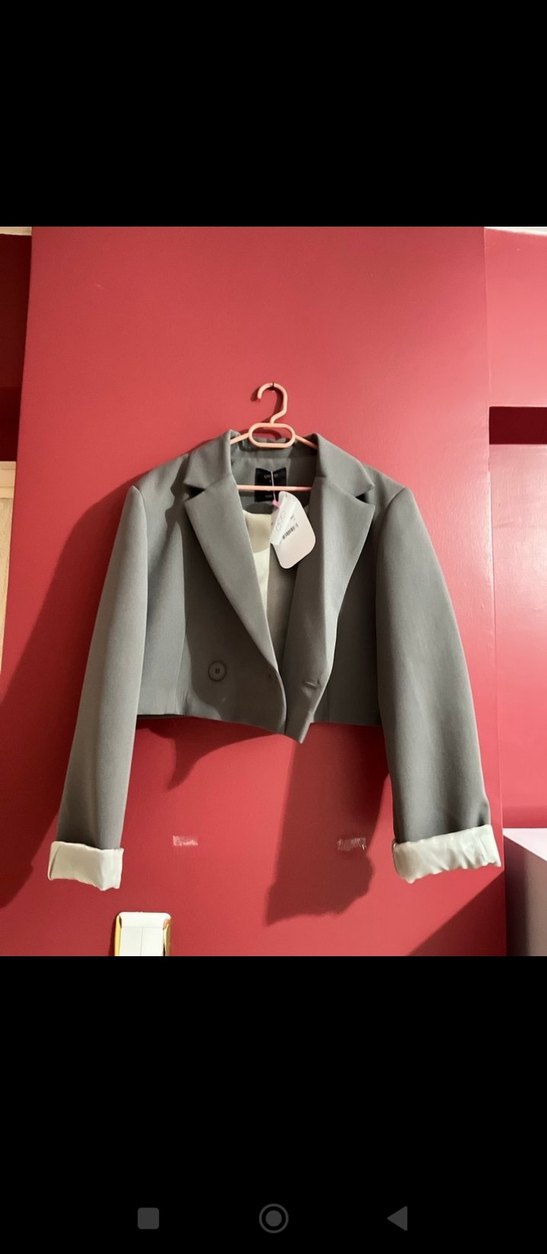 Gri mini blazer, kesik yakalı ve düğmeli ön detaylıdır. Uzun kollu, regular fit ve sentetik kumaştan üretilmiştir. Ofis için şık ve rahat bir tercih.