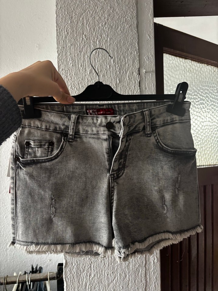 Gri tonlarında, düğmeli ve yıkanmış görünümlü mini kadın denim şort. Sokak modasına uygun, kısa paçalı ve rahat kesim.