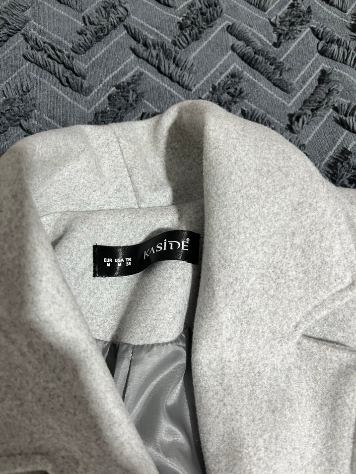 Gri renkte, sentetik kumaştan yapılmış, kürk detaylı mini kadın palto. Notch yaka, uzun kolluKASiDE markalıdır.
