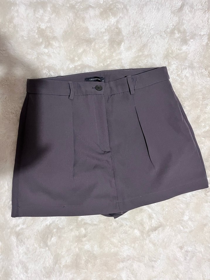 Gri renkte, sentetik kumaştan yapılmış, rahat kesim ve desen içermeyen minimalist tasarımlı mini kadın şort. Ofis ve günlük kullanım için uygundur.