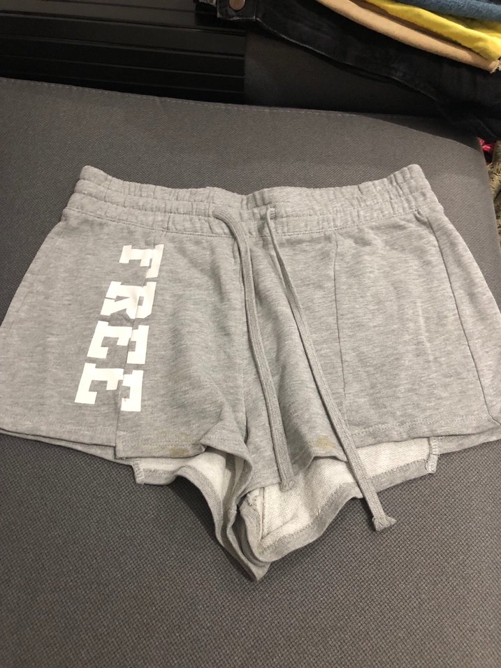 Gri, bol kesim mini şort, yumuşak ve sıcak kumaşlı, fermuarlı ceplidir. Yanında "FREE" baskısı vardır. Spor ve sokak stiline uygundur. ♀️