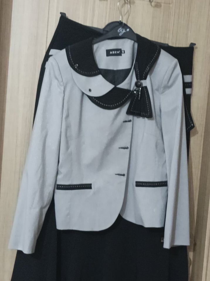 Gri renkte, kısa boy, düğmeli kadın takım elbisesi. Notlu yaka ve askılı kollarıyla sokak stiline uygun, ofis için ideal.